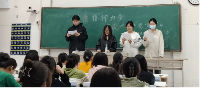 《共产党宣言》是马克思和恩格斯为共产主义者同盟起草的纲领,是国际共产主义运动的第一个纲领性文献,也是马克思主义诞生的重要标志。《共产党宣言》是一部秉持人民立场、为人民大众谋利益、为人民谋解放的经典著作。历史书上寥寥的几行,却是他们为之奋斗的一生。活动上,朱早早、余娜、渠坤、黄晓淼同学朗读《共产党宣言》中的内容,与同学们重温红色经典,共同追念先辈精神,感悟信仰力量,守望初心使命。