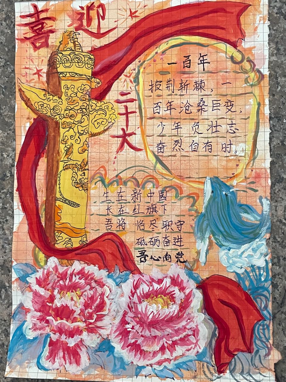 同学们通过对党的二十大会议内容的认知,进行绘画创作。作品积极向上,主题明显。同学们热情讴歌党波澜壮阔的发展历程,礼赞党的丰功伟业,充分展示员工的艺术风采和智慧才情,句句真情赞祖国,字字真爱颂华夏。