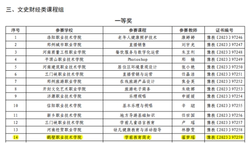 近日,河南省教育厅下发《关于公布 2023 年河南省高等职业教育课堂教学创新大赛获奖名单的通知》,人文教育学院教师翟梦瑶荣获一等奖,大赛同时认定一等奖获奖作品为河南省职业教育“课堂革命”典型案例。