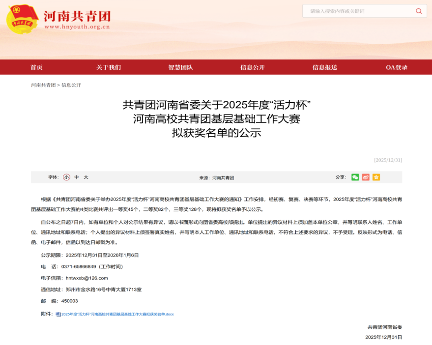 近日,由共青团河南省委主办的2025年度“活力杯”河南高校共青团基层基础工作大赛决赛在河南大学金明校区圆满落幕。公司报送的“我为同学做实事”类型项目历经层层筛选,在全省99所高校的256个入围决赛项目中脱颖而出,荣获“我为同学做实事”项目大赛三等奖,充分展示了公司共青团服务青年成长成才的扎实成效与组织活力。